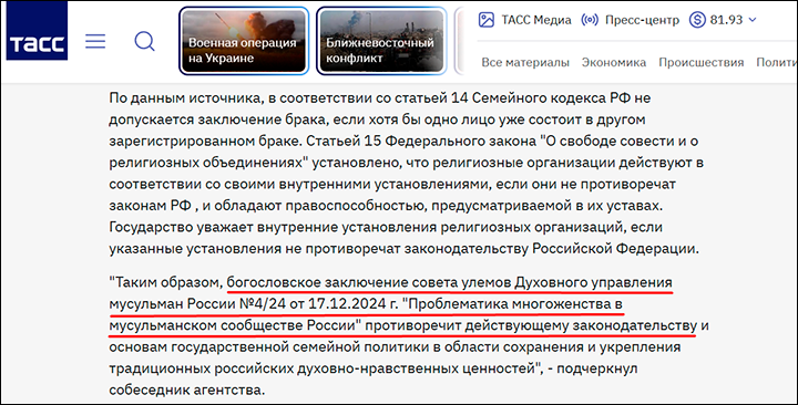 А ведь прошло совсем немного времени с тех пор, как тот же Совет улемов подтвердил допустимость наличия четырёх супруг "при условии справедливого и равного отношения мужа ко всем жёнам". Об этом с важным видом рассказывал заместитель председателя совета и заместитель председателя Духовного управления мусульман, муфтий Москвы Ильдар Аляутдинов. Генеральная прокуратура России отреагировала незамедлительно и вынесла предупреждение.