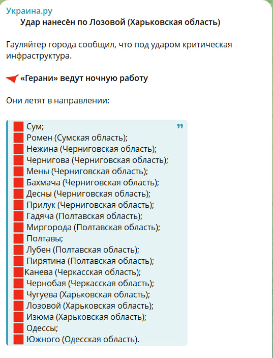 В данный момент основная атака в Харьковской область идёт по Лозовой – вероятно, целями является железнодорожная инфраструктура и склады с вооружением. Кроме того, под ударом энергетика в самом Харькове. К 01:30 удары также зафиксированы в Черниговской и Киевской областях.