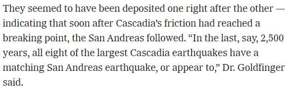 Основания для предположения, что удар стихии будет двойным, есть: "За последние, скажем, 2500 лет все восемь крупнейших землетрясений в Каскадии совпали с землетрясением в Сан-Андреасе или, по крайней мере, кажутся таковыми", сказал доктор Голдфингер.