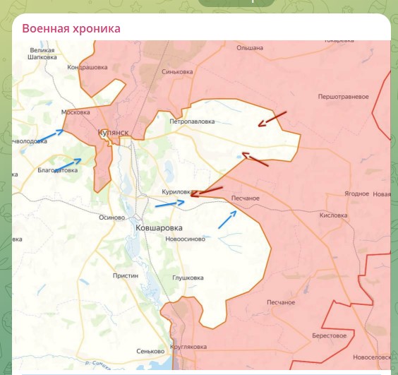 "На Купянском направлении ВСУ активно контратакуют по всему западному периметру, стремясь вернуть ранее утраченные позиции в районах Песчаного, Степовой Новосёловки, Куриловки. Тем не менее, о каких-либо успехах на направлении мониторинговые сервисы не сообщали. ВС РФ, в свою очередь, продолжают "рассекать" гарнизон ВСУ продвижением в районе Куриловки, что значительно усложняет логистику противника. В случае, если наши войска на данном участке приблизятся к Купянску-Узловому с востока, украинские подразделения окажутся в оперативном окружении. Как и в Покровске, закрывать кольцо полностью не будет необходимости — ширина "горловины" не позволит организовать безопасный выход. При этом, подразделения ВСУ, находящиеся в Ковшаровке и восточнее также окажутся в полуокружении, выход из которого будет осложнен необходимостью преодолеть реку Оскол", – описывает ситуацию "Военная хроника".