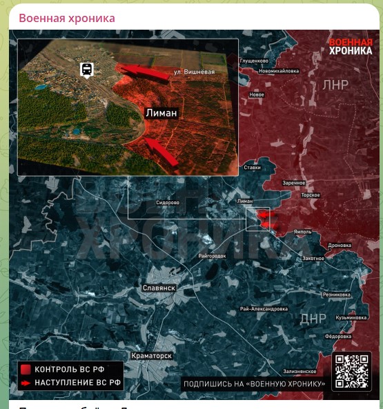 Южнее Купянска и севернее Константиновки всё масштабнее разворачивается битва за Красный Лиман. Уже третья за время СВО – наши заходили сюда в 2022, отступали и снова берут своё. Накануне появились сообщения о том, что русские штурмовые отряды прорвались в южную часть города.